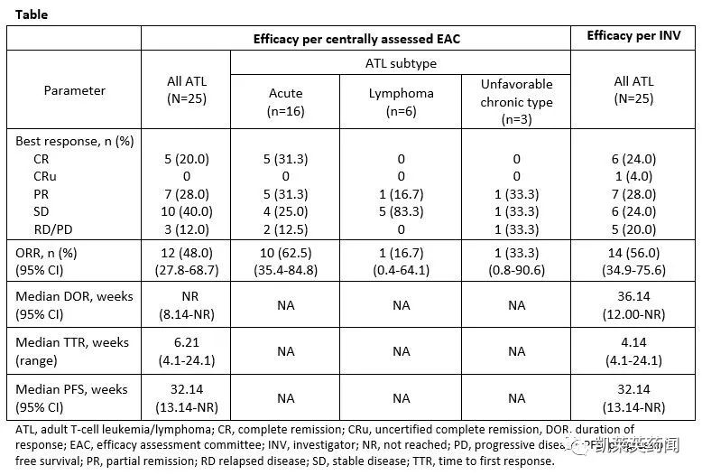 数据显示:valemetostat 在先前接受过治疗的患者中表现出 48% 的客观反应率;在 20% 的患者中观察到完全反应,在 28% 的患者中观察到部分反应。对于日本患有侵袭性 ATL 亚型的患者,中位总生存期长达 12 个月。