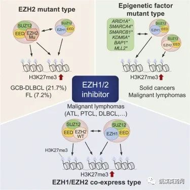 EZH即Zeste同源物增强子,是Polycomb蛋白家族PRC2复合体的催化酶,具有组蛋白甲基转移酶(HMTase),介导基因沉默。EZH1和EZH2作为同源基因,其中EZH1在非增殖性成体器官中的表达更为丰富,HMTase活性相对更弱;EZH2则与增殖密切相关,在干细胞和肿瘤细胞中表达较高。研究发现,在多种恶性肿瘤细胞中存在EZH2的突变及异常表达,与癌症的发生、发展、转移、侵袭及预后不良有重要关系。