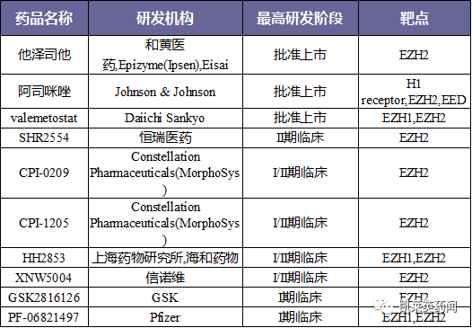 第一三共并不是唯一一家致力于开发双 EZH1 和 EZH2 抑制剂的公司,除此以外还有辉瑞的PF-06821497,目前处于滤泡性淋巴瘤、小细胞肺癌和去势抵抗性前列腺癌的 I 期开发中;此外,海和也正在开发HH2853用于外周T细胞淋巴瘤、实体瘤等适应症。将部分处于临床以上阶段的EZH抑制剂统计如下: