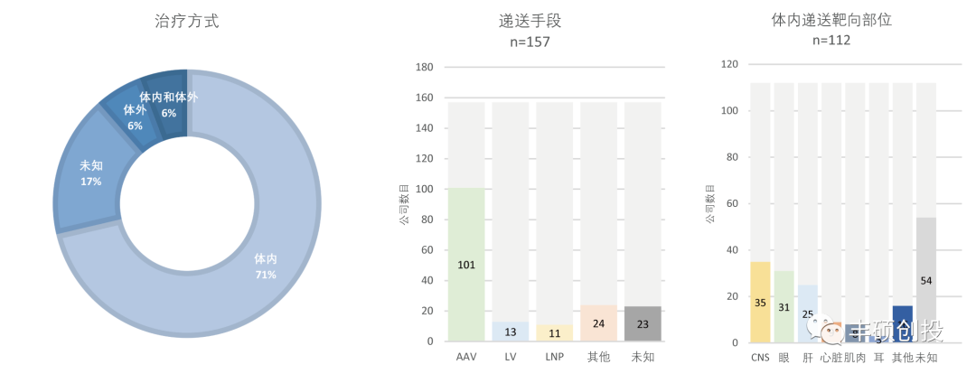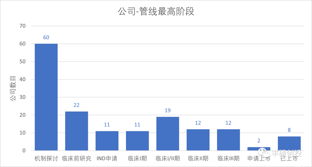 由图可知,处在临床III期及之后的公司少之又少,超过半数公司处在机制探讨及临床前研究阶段,但同时也有近1/3的公司即将或已经进入临床早期阶段。由此可看出,基因治疗公司绝大多数仍处在早期技术、临床探索阶段,机会与风险同在。整体可以说是大规模播种阶段,技术攻坚以及临床探索将会是基因治疗未来发展主旋律。