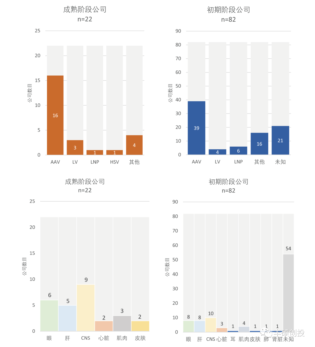 我们以临床III期阶段及之后列为成熟阶段,看过往成功经验;将处于概念验证及临床前研究阶段列为初期阶段,看当前趋势。成熟阶段的公司以AAV递送为主,多靶向CNS、眼、肝等领域,基本代表所有基因治疗公司的主要走向;初期阶段的公司,AAV仍是主流手段但占比有所下降,出现了许多其他递送手段的探索以及新的靶向位置(图3)。由此可知,基因治疗领域较为成熟公司多采用AAV、LV载体,主要靶向CNS、眼部和肝脏;而当前新兴基因治疗公司除了布局AAV载体,出现了部分新载体的探索以及新靶向的探索。