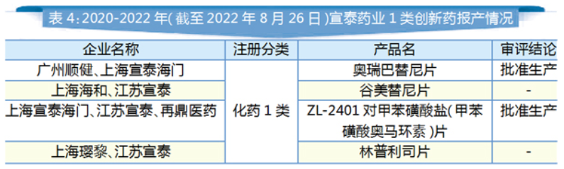 宣泰药业承接了3家企业的1类新药的委托生产,是国内近三年承接化药1类委托生产方中报产最多的企业。