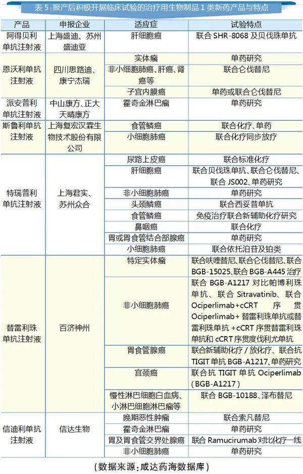 治疗用生物制品近三年申报了31个产品,其中21个是单抗类产品。21个单抗产品中,有7个产品在申报上市后仍积极开展临床,分别是阿得贝利单抗注射液、恩沃利单抗注射液、派安普利单抗注射液、斯鲁利单抗注射液、特瑞普利单抗注射液、替雷利珠单抗注射液和信迪利单抗注射液。