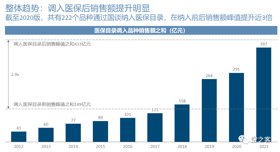 前五次国谈一共有222个品种成功调入目录,销售峰值总和从调入前的149亿提升到433亿,涨幅近3倍,而在2017年以前在医保以外的增量是相对缓慢的。医保目录对创新药的及时纳入,无可争议地提供了销售额的增量,并且目前的支付总量还至多只在千亿量级,相对整个医药市场近2万亿规模还非常有限。这也与之前《医保控费颠覆了什么行业逻辑》文末的分析相吻合。