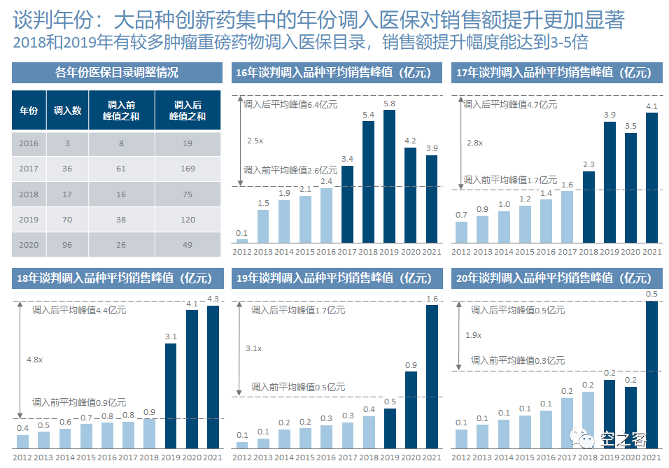 2. 谈判年份如果大家还记得,2018和2019两年的国谈在当时是引发了较大的反响和争议的,核心焦点是PD-1和替尼们被大幅压价,后来蔚然成风的“医保扼杀创新”论大概就自此始。诚然,PD-1在降价后一下从千亿蓝海白天鹅变成百亿内卷丑小鸭,势必是让创新药的商业价值大幅低于了部分人的想象(是不是也应检讨一下自己想象力的问题),但说扼杀应该还是过激了,毕竟医保谈判成功很明显还是给这些药物带来了增量,尤其是大品种创新药收益更加明显。