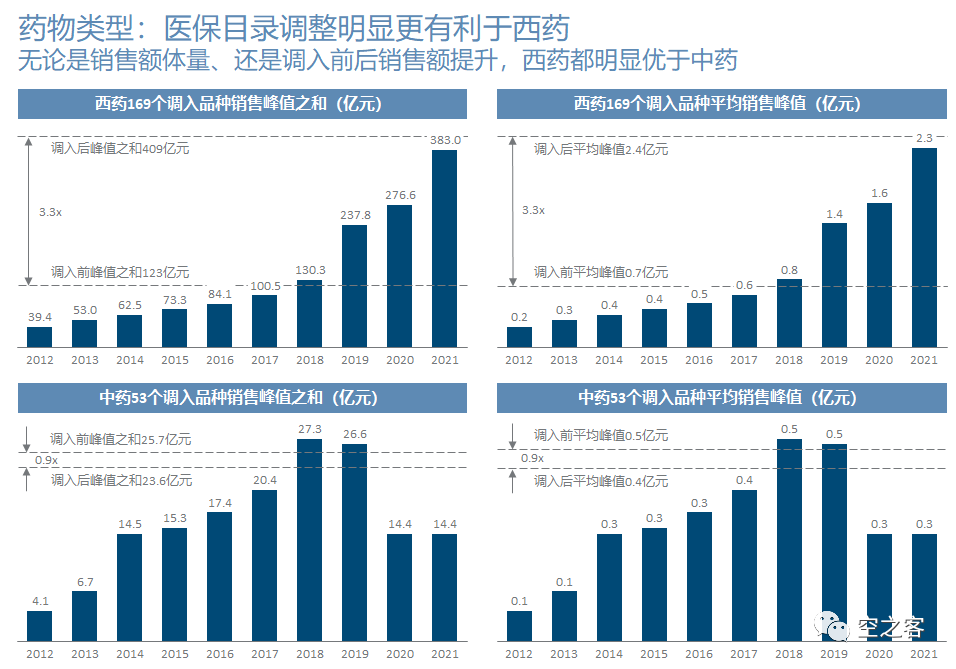 3. 药物类型医保目录调整时长被诟病的另一个主题,就是纳入了中成药品种。不过事实情况是,中成药在医保局那里并没有占到什么便宜,甚至在谈判调入后销售额不升反降(这还是在某些品种先升后降、按照文初所述计算规则是界定为销售峰值提升的)。主要原因是中药新品种调入后放量并不快,而老品种在调入后反而遭遇注射剂和辅助用药整治等政策措施,导致销售额出现下降。