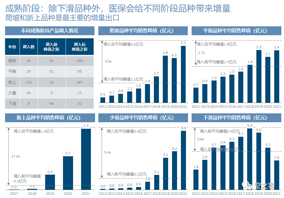 可以看到,除了已经下滑的品种(大概率是专利过期甚至是集采品种)以外,各不同阶段品种都会从医保获得销售额提升:爬坡阶段和新上阶段的品种在医保谈判中获益最多,谈判前基本卖不动的少量品种也有可能借机获得一些增量,即使是平稳品种也会获得稳定提升。