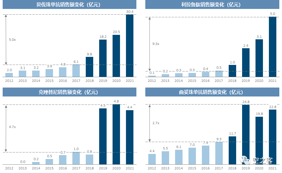 6. 代表品种爬坡阶段是医保增量的主力出口,这些药虽然老,但因为临床价值非常明确,哪怕没进医保也在稳定爬升,而谈判时纵使大幅降价也能通过倍增的销量获得总量的大幅跃升。最具说服力的就是贝伐单抗这种,上市多年、甚至很快生物类似药都扎堆获批,按一般思路就肯定是像集采那样断崖下跌,然而事实却是一路成了超重磅品种。