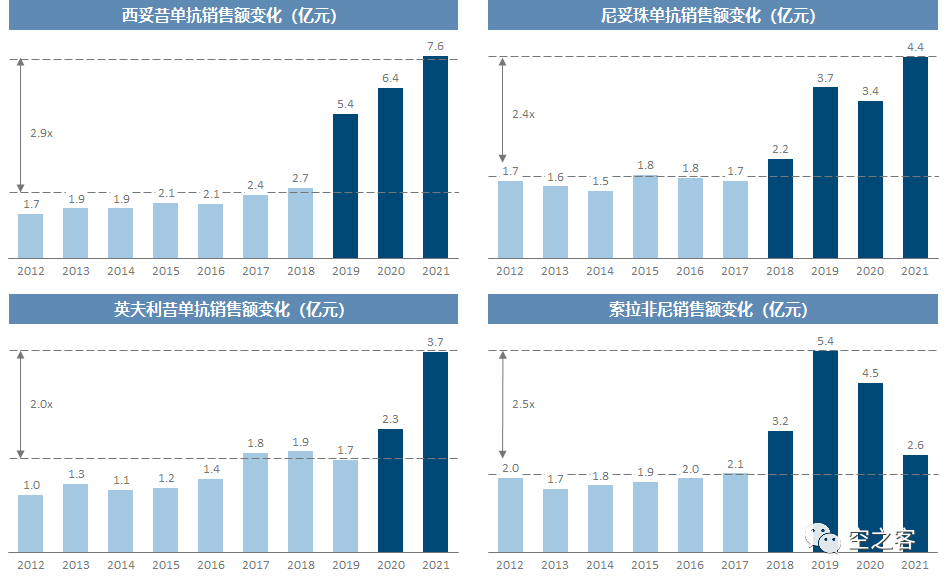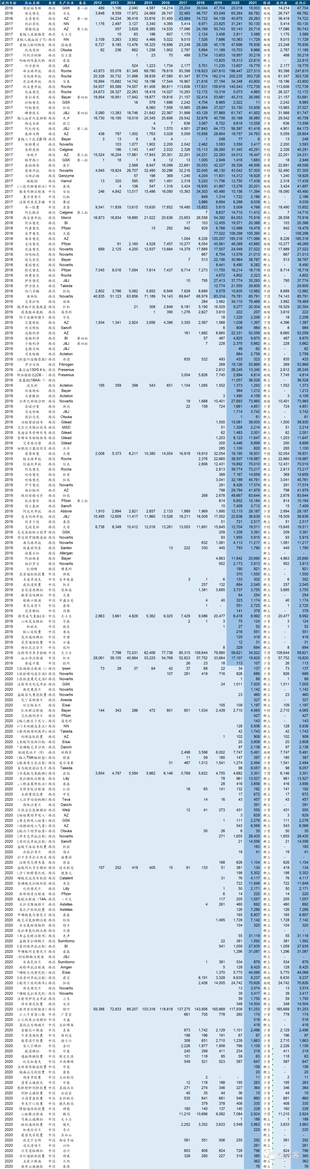 须做几点说明:1)因样本医院数据口径所限,销售额总数以及不同适应症药物之间的横向可比性会有所影响,但同一品种纵向完全可比;2)销售额是按照通用名口径归集,即仿制药和生物类似药都会与原研药一并考虑;3)考察销售额变化以谈判前峰值和谈判后峰值为准,不排除因集采、竞品挤压市场份额、政策不利等因素在谈判后销售额出现回落的情况,但应不影响结论;3)各分组的谈判前后销售额平均峰值,是将峰值做算术平均,因不同品种出现峰值年份不同,因而可能出现与各年份平均销售额的峰值略有不同(即,这不是一个“阿贝尔群”,PS:好开心我居然还能装得了这种13),但也不影响结论。