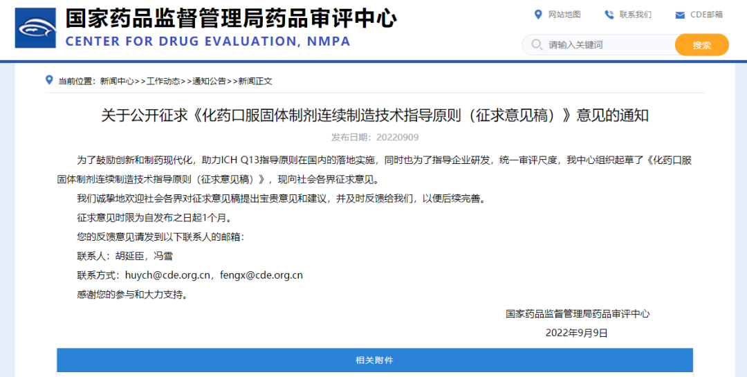 7)2022年9月9日,CDE发布公开征求《化药口服固体制剂连续制造技术指导原则(征求意见稿)》,征求意见时限为自发布之日起1个月,这是国内首部针对制剂连续制造技术指导原则,弥补了我国对制剂连续制造技术在法规层面和技术层面的空白,本指导原则的起草,借鉴了国外相关指导原则及标准,阐明了化药口服固体制剂连续制造的基本考虑,相关要求与ICH Q13的基本原则和理念保持一致,主要内容包括:概述、总体考虑、相关概念、控制策略、工艺验证、稳定性研究、批量变更、药品质量体系、申报资料要求、参考文献共十部分。