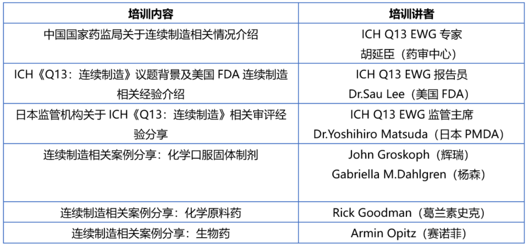 5)2022年8月,CDE与中国药品监督管理研究会合作举办《连续制造相关概念及实例研究》线上培训,此次培训将邀请来自国外监管机构的ICH Q13专家工作组(EWG)专家和具有连续制造实践经验的企业专家担任讲者,进行连续制造技术要求解读和案例分享,议题和培训人摘录如下表: