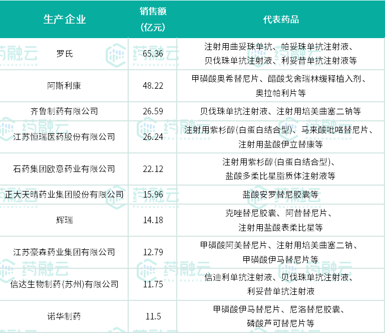 截图来源:药融云全国医院销售数据库据药融云统计,2021年抗肿瘤药物院内市场销售额总计超885亿元,同比增长13%,2022年也在稳定增长。从企业来看,TOP10药企中跨国企业有4家,分别为罗氏、阿斯利康、辉瑞和诺华制药,本土药企有6家,分别为齐鲁制药、江苏恒瑞、石药欧意、正大天晴、江苏豪森和信达生物。具体情况见下表。2022年H1抗肿瘤药物院内市场生产企业TOP10