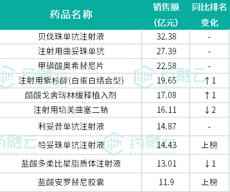 数据来源:药融云全国医院销售数据库结合近期更新的药融云全国医院销售2022年Q2数据,2022年H1已有10个抗肿瘤药物的销售额突破10亿元,反映了这些药品的临床价值和市场潜力。罗氏“三驾马车”——贝伐珠单抗注射液、注射用曲妥珠单抗和利妥昔单抗悉数上榜,同时这3款药物也是拥有较多生物类似药的单抗。相较于2021年H1,帕妥珠单抗注射液和盐酸安罗替尼胶囊最新上榜院内销售额TOP10,排名第8和第10。2022年H1抗肿瘤药物院内销售TOP10
