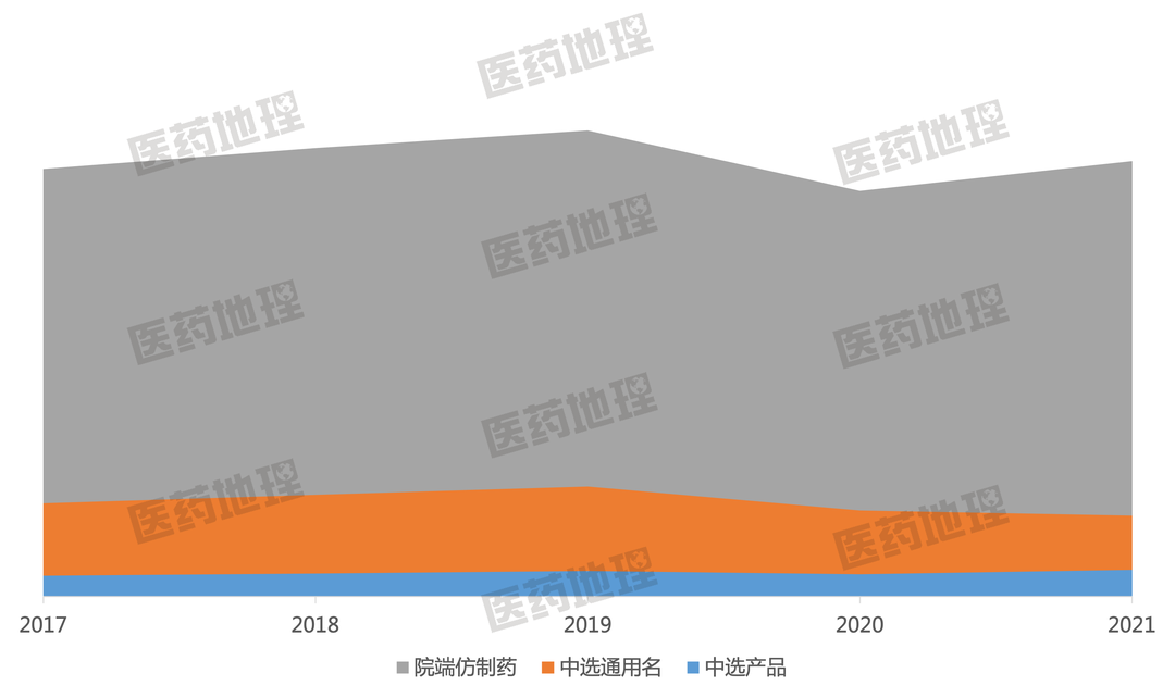 集采对院内仿制药市场影响有限,疫情影响更明显。图1最下面蓝色面积是中选产品(通剂规企),中间橙色面积是中选通用名。一方面,从2017年到2021年,中选产品市场规模整体呈上升趋势,占比从4.8%上升至6.1%;另一方面,与院端仿制药对比,中选产品市场规模小,历年占比均在4%-6%之间浮动,对市场影响较小。