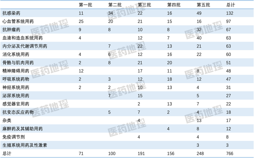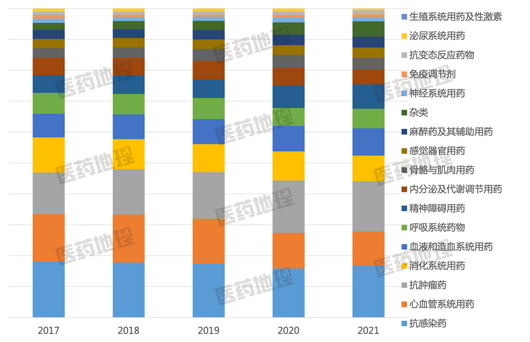 除这两个大类外,其他治疗大类占比多下降,尤其是占比较高的大类,如血液和造血系统用药、抗感染药、心血管系统用药和消化系统用药,下降幅度从2%到5%不等。