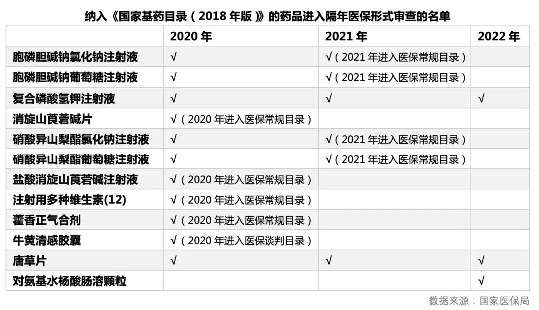 2020年起,纳入《国家基药目录(2018年版)》的药品都有望进入医保目录。纳入《国家基药目录(2018年版)》的药品并进入形式审查名单的数量,从2020年的11个下降到2021年3个,复合磷酸氢钾注射液和唐草片自2020年以来一直没有成功进入医保目录。