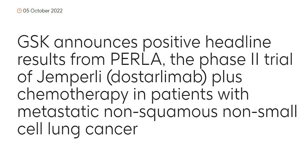 10月5日,GSK宣布其PD-1单抗Jemperli(dostarlimab)联合化疗头对头比较Keytruda联合化疗一线治疗转移性非鳞状非小细胞肺癌(NSCLC)的II期PERLA试验取得阳性结果,达到客观缓解率(ORR)主要终点。