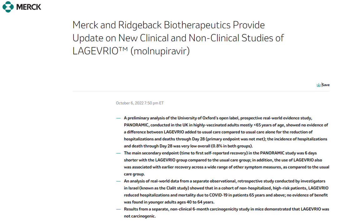 10月6日,默沙东和Ridgeback Biotherapeutics 发布了口服抗病毒 COVID-19 药物 LAGEVRIO ™(molnupiravir,莫努匹韦)两项真实世界临床证据和一项非临床研究进展。