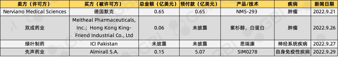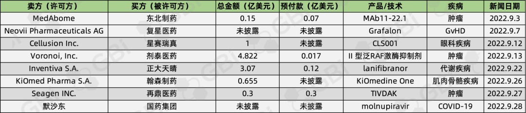 2022年9月,本土企业的许可引进(License-in)和对外许可(License-out)交易依旧活跃。根据GBI SOURCE数据库全球交易板块,共有以下十余笔相关交易,其中以License-in居多,主要涵盖肿瘤、代谢、神经系统等领域。