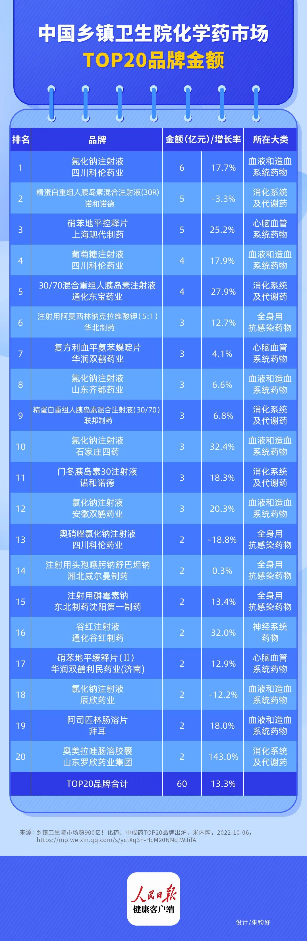 近日,人民日报健康客户端报道:中国乡镇卫生院化学药市场TOP20出炉,抗感染药物年售175亿元位居第一。