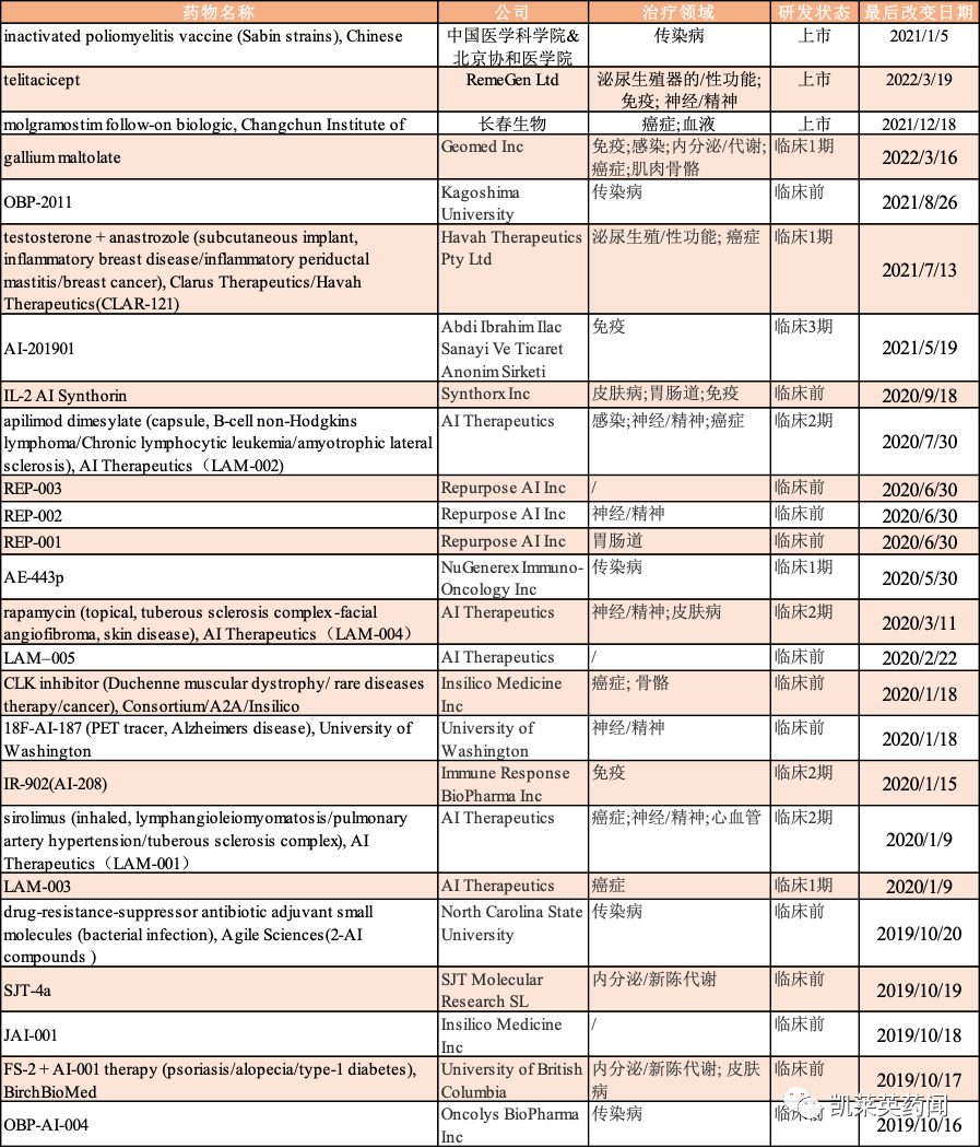 1、根据DeepPharma Intelligence 数据统计,截至2022 年第一季度,全球AI 制药初创企业超过495 家,参与AI药物研发的大型药企超过56 家,其中包括逾36 家传统药企和20 家CRO(医药研发合同外包服务机构)企业;互联网企业超过31 家。据统计,截至6 月20 日,共有26 家企业的约51 个由AI辅助进入临床I期的药物管线;其中,美国企业占多数,有英矽智能、未知君、冰洲石生物3 家中国企业上榜。