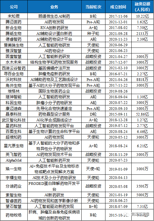 2021年AI制药领域融资情况