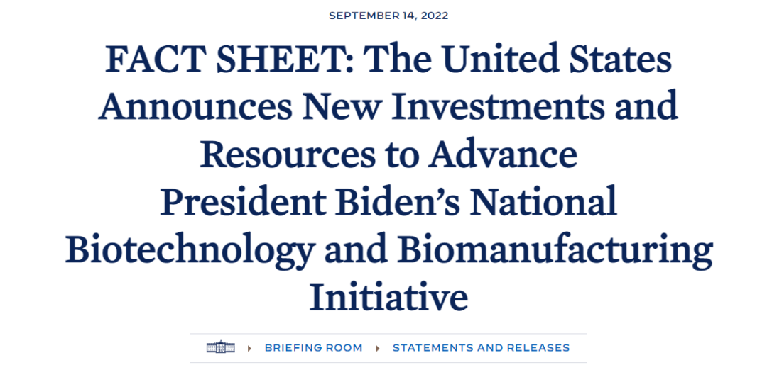 [1] https://www.whitehouse.gov/briefing-room/statements-releases/2022/09/14/fact-sheet-the-united-states-announces-new-investments-and-resources-to-advance-president-bidens-national-biotechnology-and-biomanufacturing-initiative/