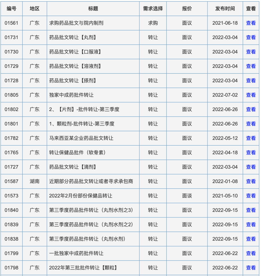 2022年上半年,某医药资产变动交易平台上发布多个中成药批文转让信息。