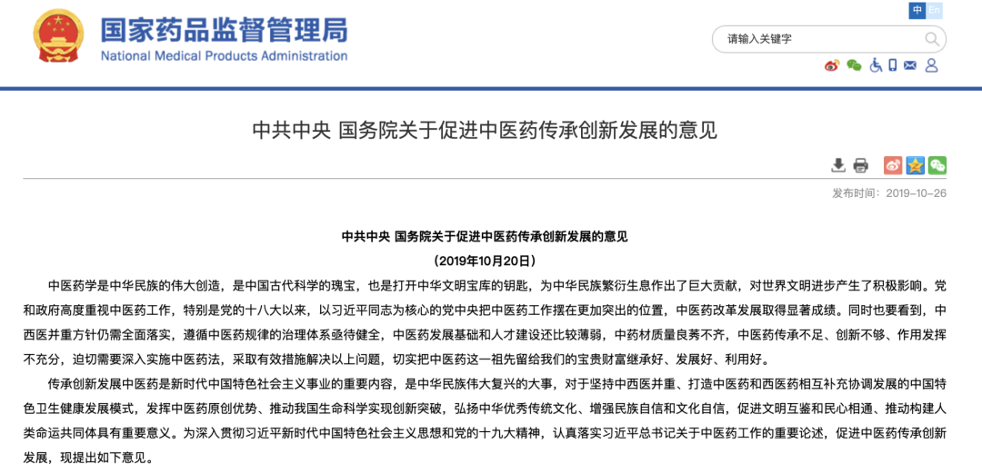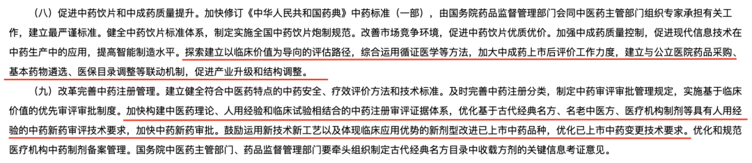 2019年10月发布的《中共中央 国务院关于促进中医药传承创新发展的意见》明确,促进中药饮片和中成药质量提升。“探索建立以临床价值为导向的评估路径,综合运用循证医学等方法,加大中成药上市后评价工作力度,建立与公立医院药品采购、基本药物遴选、医保目录调整等联动机制,促进产业升级和结构调整。”