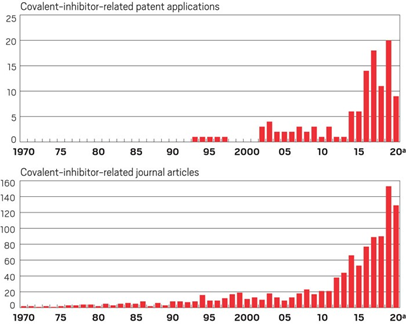 因此,共价键药物相对于非共价键结合的药物而言,可以产生更长的药效时间,而且所需剂量更低。基于这些优势,共价键药物近年来逐渐成为了制药公司的关注对象。这一点,单从近些年该类药物的专利与文献数量增长便可略知一二(图2)。