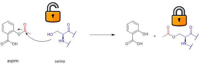 人们熟知的阿司匹林就属于共价键药物,它的乙酰基在体内与受体酶上的丝氨酸反应,使得丝氨酸被乙酰化,并使该酶失去催化导致炎症和凝血分子形成的功能(图3)。因而阿司匹林在那个时代被视为消炎、解热和抑制血栓形成(从而预防心肌梗死,中风以及心绞痛)的神药。其本质的作用机理都是由于乙酰转移的反应。
