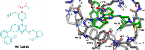 进入临床阶段的KRAS G12C共价抑制剂分子与其受体蛋白之间并没有像传统药物那样的强非共价结合力,但当它们结合在一起时,药物分子上的活性基团迅速与KRAS G12C的Cys12反应。比如Mirati Therapeutics 的临床药物MRTX849 (Adagrasib)(图6)。