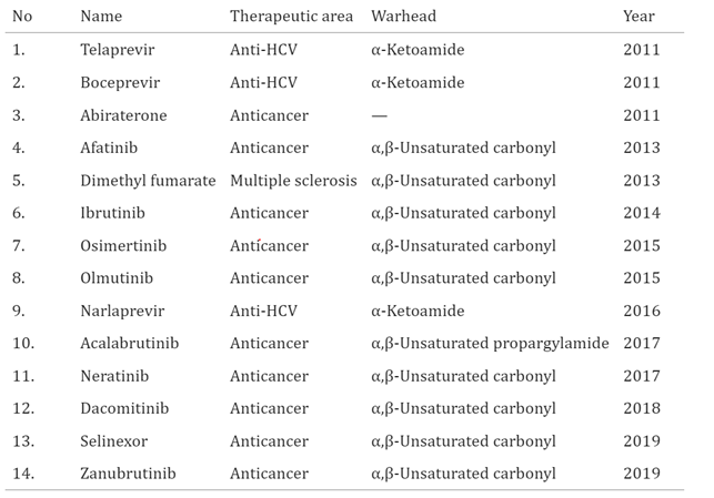 表1. FDA在2011-2019年间批准的共价键药物 (数据来源:RSC Medicinal Chemistry)