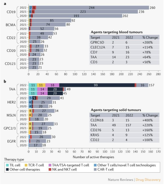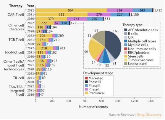 市场的增长也推动了研发积极性。2022年6月Nature上发表了一篇题为“Landscape of cancer cell therapies: trends and real-world data”的文章分析了全球细胞免疫疗法研发概况。截至2022年4月15日,在全球的免疫肿瘤学研究管线中,有2756种活性细胞治疗候选药物,其中CAR-T疗法数量较去年增长24%。