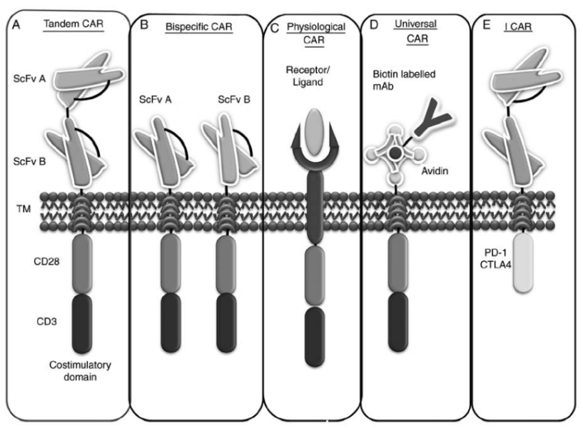 Tandem CAR:单个CAR结构通过串联的scFv使其能靶向识别两种肿瘤抗原;