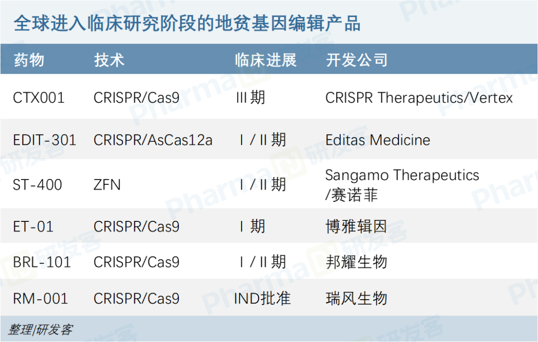 前不久,蓝鸟公司(bluebird bio)用于β-地中海贫血的慢病毒基因疗法Zynteglo在美国上市。研发客观察到,后续针对地贫的基因治疗产品多是基因编辑技术路线,不完全统计得知,目前全球已有6款针对地贫的基因编辑产品进入临床研究阶段。
