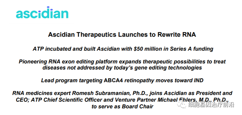 Ascidian由生命科学领域的风险投资 Apple Tree Partners(ATP)创建, 它是一家在基因编辑方面首次亮相的初创公司,通过重写 RNA 来治疗人类疾病,成立于2020年,总部位于美国波士顿。