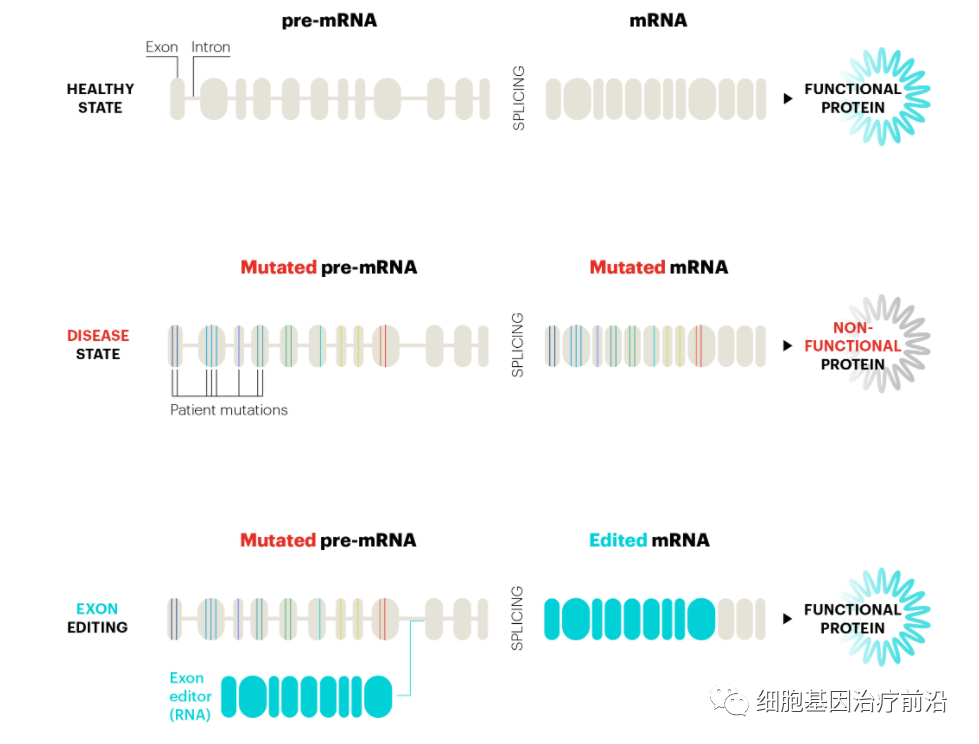 CRISPR 的发现促进了基因编辑研究,该技术现已得到扩展和调整,以支持多种基因编辑技术。与CRISPR技术不同,RNA外显子编辑的是RNA而非DNA,因此该疗法降低了非靶标基因组改变的风险。