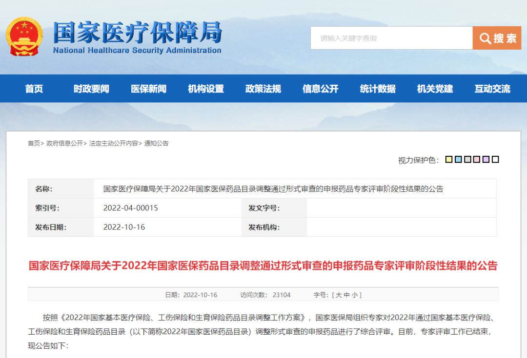 10月16日晚,国家医疗保障局关于2022年国家医保药品目录调整通过形式审查的申报药品专家评审阶段性结果的公告。