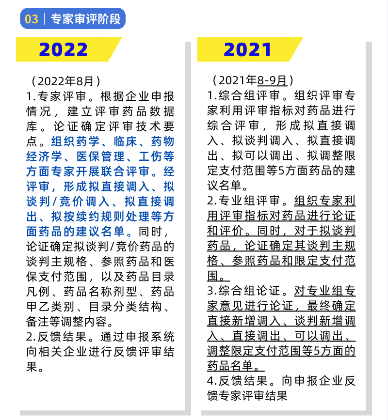 早前6月29日,国家医保局发布《2022年国家基本医疗保险、工伤保险和生育保险药品目录调整工作方案》及相关文件,标志着第五轮国家医保药品目录调整工作正式启动。其中,专家审评阶段与2021年相比,主要内容变化如下:
