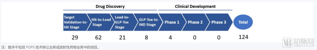 目前PeptiDream共有124条药物研发管线,大多数集中在药物的研发阶段,有4条研发项目进入临床I期。