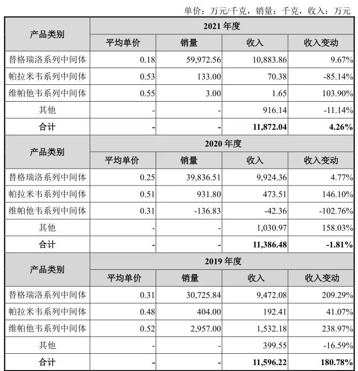 公司原料药中间体收入情况 来源:泓博医药招股书