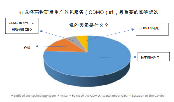 第一个调查包含了一个问题:“在选择药物研发生产外包服务(CDMO)时,最重要的影响您选择的因素是什么?“