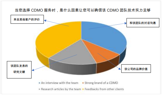 绝大多数被调查者都会选择“技术团队实力“作为选择 CDMO 的条件。调查的第二个问题:”当您选择 CDMO 服务时,是什么因素让您可以确信该 CDMO 团队技术实力足够达到要求?”