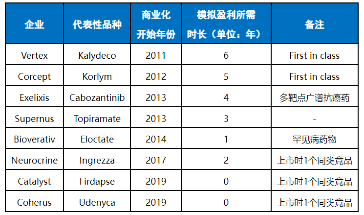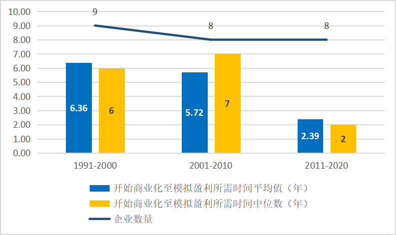 对图2中统计的近十年(2011-2020年)开始商业化且成功的8家美国Biotech企业进行进一步信息挖掘,从趋势上看随着时间的推移模拟盈利所需时长同样在逐渐降低。