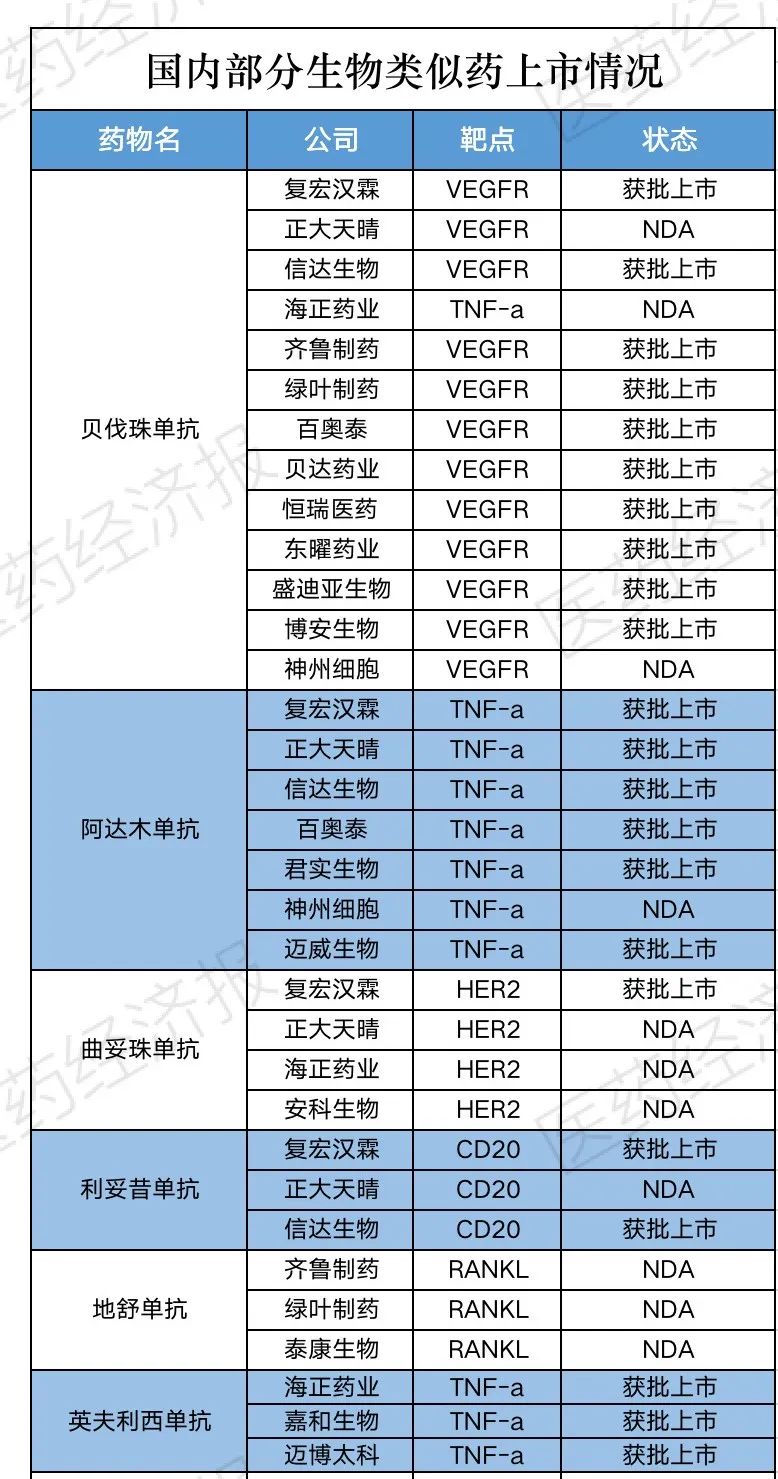 目前国内约180家药企已布局生物类似物的产品研发,共涉及约400款药物,在研的生物类似药大多集中在CD20、VEGF、HER2等热门靶点,竞争将不言而喻。国内药企上市的生物类似药,主要是这六款:贝伐珠单抗、阿达木单抗、曲妥珠单抗、利妥昔单抗、地舒单抗和英夫利西单抗。