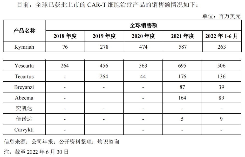 在中国,已上市复星凯特的奕凯达、药明巨诺的倍诺达价格分别为120万元/针和129万元/针,由于两者均在2021年上市,当年分别实现销售额约1亿元、3079.7万元。依据海外的放量曲线分析,往往考验CAR-T新产品销售情况在第2-3年,2022年上半年药明巨诺的开具了77张倍诺达处方,实现销售收入约6600万元。