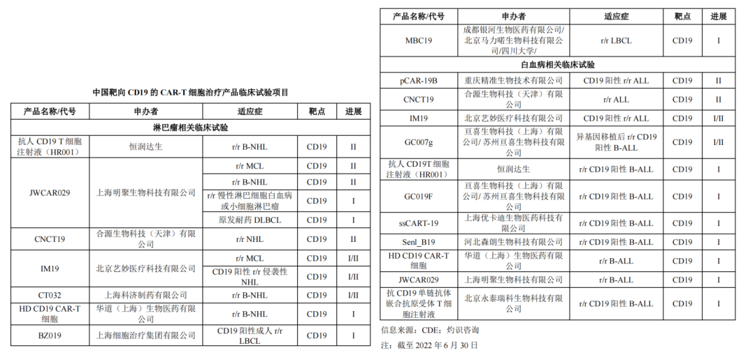 以最热门的靶点CD19为例,目前已上市奕凯达、倍诺达获批适应症均为弥漫性大B细胞淋巴瘤(DLCBL,淋巴瘤中国内新发病患数最大的适应症,属于B-NHL),现处于临床阶段有接近20款CD19 CAR-T产品。