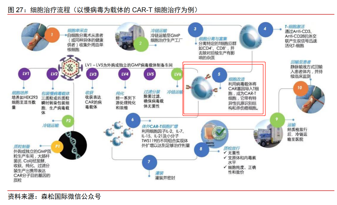 目前,影响CAR-T生产成本最大的两项因素是产能利用率和病毒载体,提升生产规模和降低基因转导载体的成本是降低CAR-T成本最有效的方式。