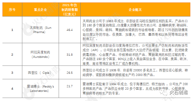 仿制药领域,目前印度90%的公司主要从事仿制药的生产,在2021年全球仿制药TOP10企业中印度药企占40%。其中,太阳制药作为印度药企龙头,在2021年度仿制药销售额为46.4亿美元。其次为阿拉宾度制药、西普拉、雷迪博士,销售额分别为31.8、26.5、21.7亿美元。